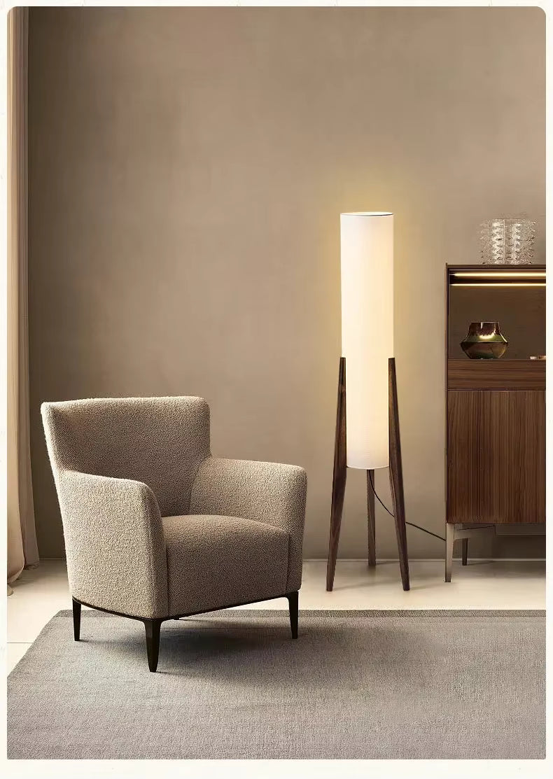 Breng een subtiele Zen-sfeer in je interieur met de KuroLume vloerlamp. Het zwarte walnotenhout en de slanke cilindrische kap ademen eenvoud en tijdloze elegantie, terwijl het drietal poten een gevoel van balans en rust creëert. Het zachte, warme licht vult je woonkamer, slaapkamer of leeshoek met een uitnodigende gloed en nodigt uit tot ontspanning. Een minimalistisch sculpturaal accent dat natuurlijke materialen en serene vormen perfect combineert – een stukje wabi-sabi in je moderne huis.