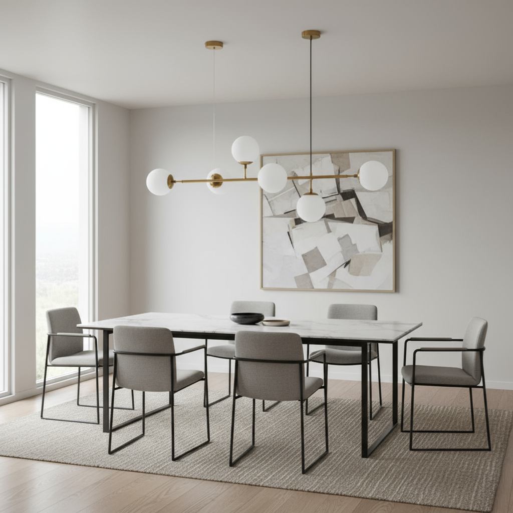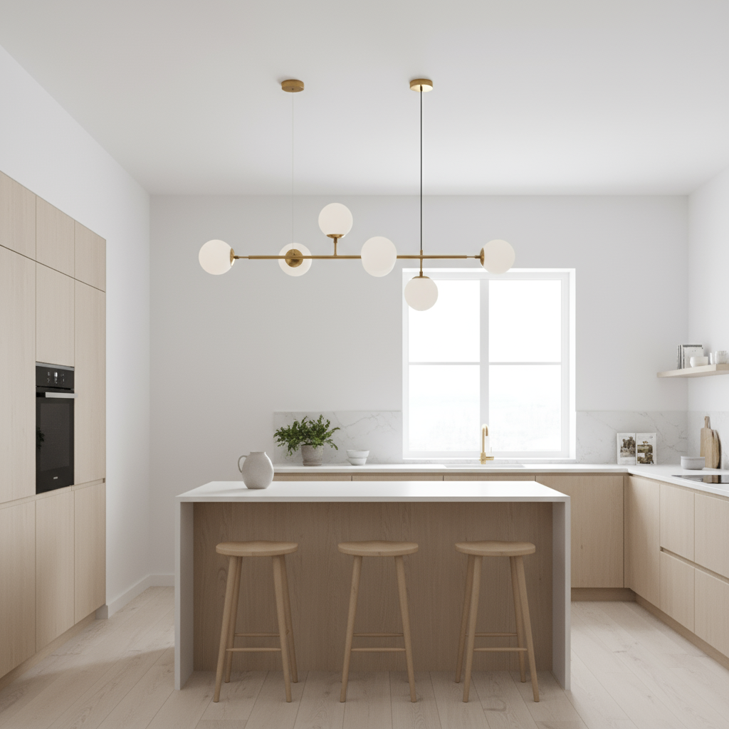 Met haar strakke metalen lijnen en zwevende vorm lijkt de Kula Boll haast gewichtloos — een samenspel van licht, lucht en elegantie. Of ze nu boven de eettafel hangt, een hoge ruimte siert of een stijlvolle bar verlicht, deze lamp trekt moeiteloos de aandacht zonder te overheersen.