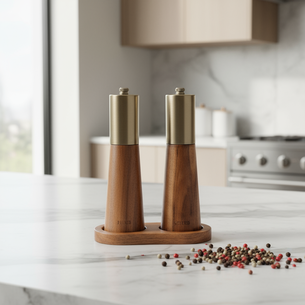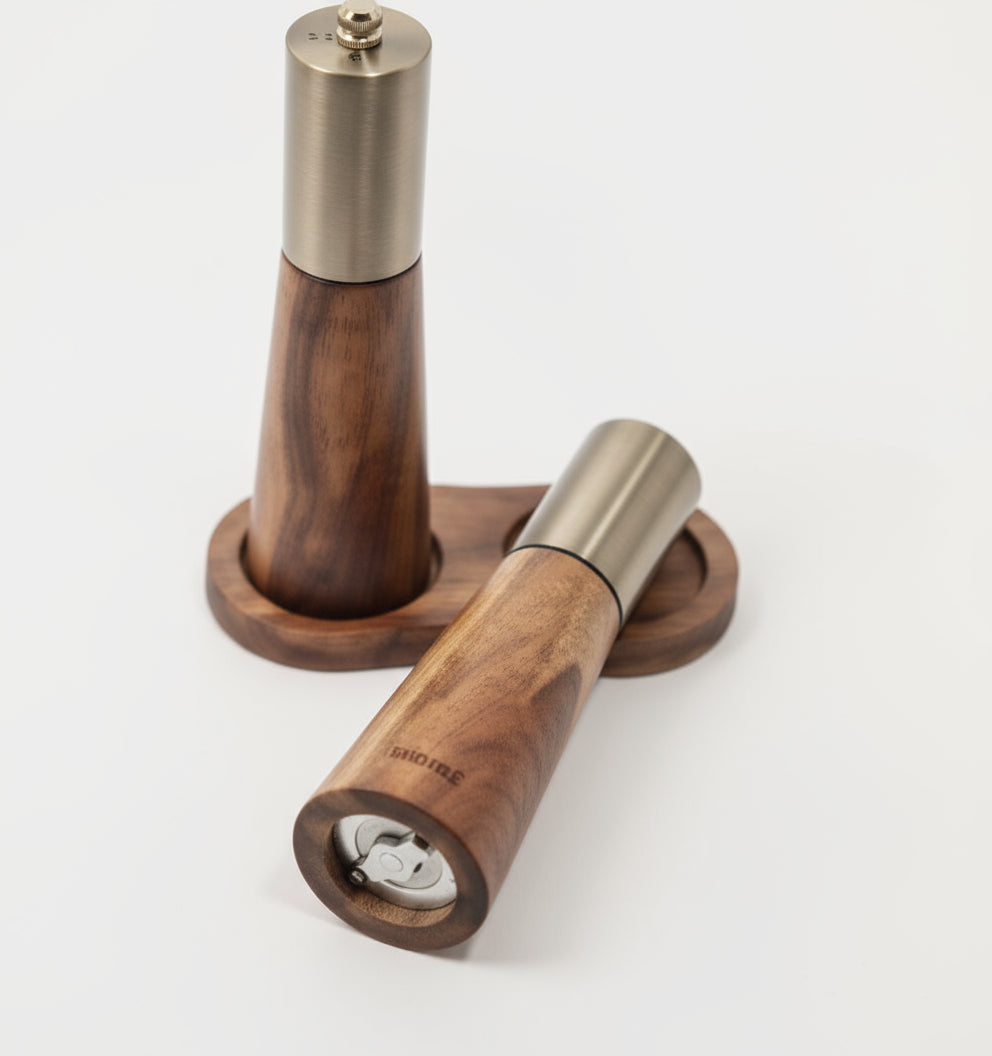 Met een houten basis en roestvrijstalen molens straalt deze set rust, kwaliteit en verfijning uit — perfect voor wie ook aan tafel oog heeft voor detail.