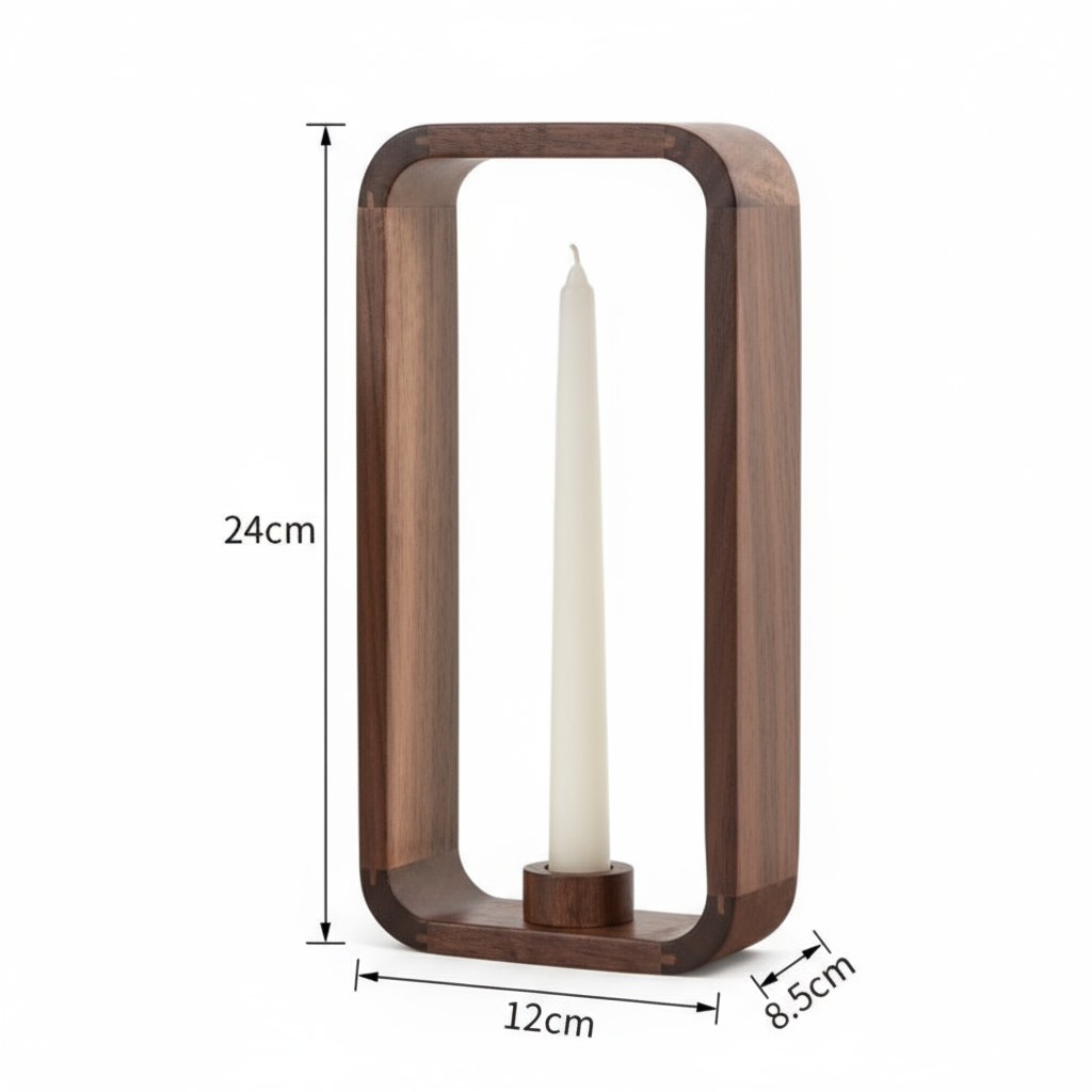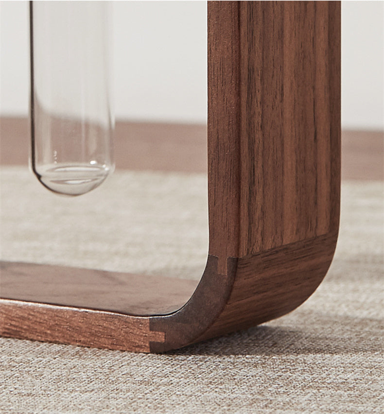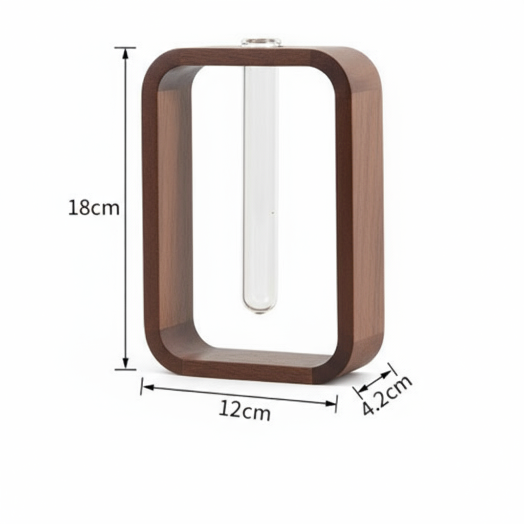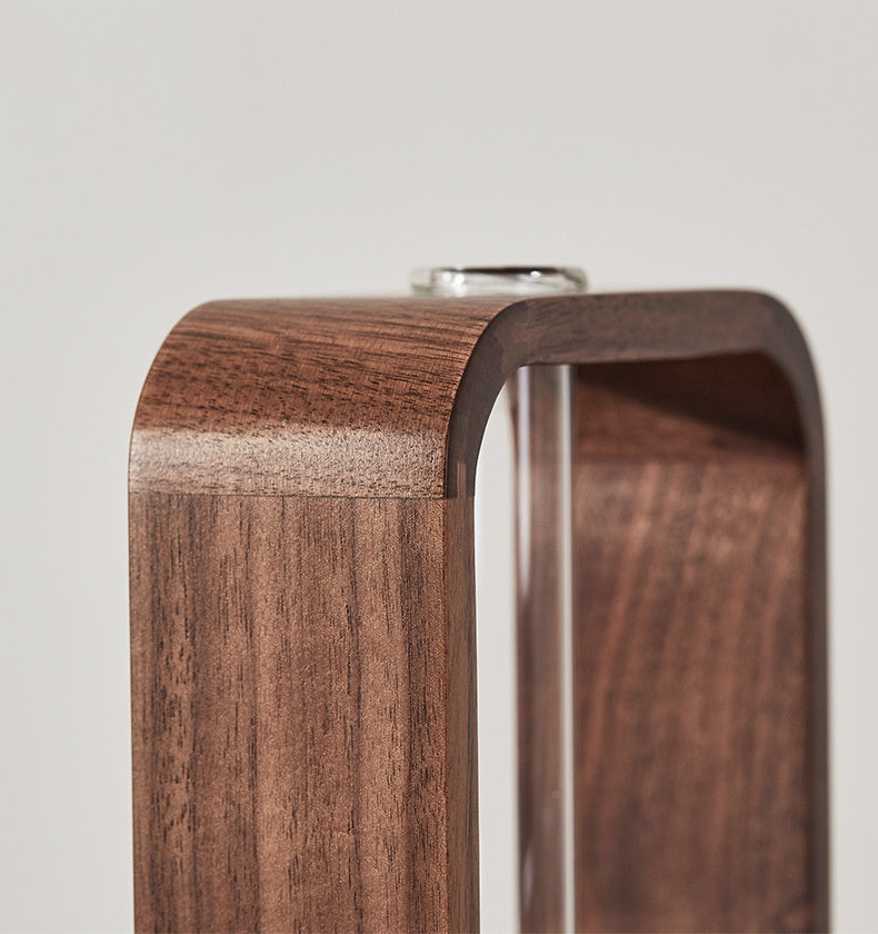 De Zenframe combineert natuurlijke materialen met tijdloze elegantie. Het massief zwarte walnotenhout vormt een warm, natuurlijk contrast met de strakke borosilicaatglazen buis, die eenvoudig te verwijderen en te reinigen is.